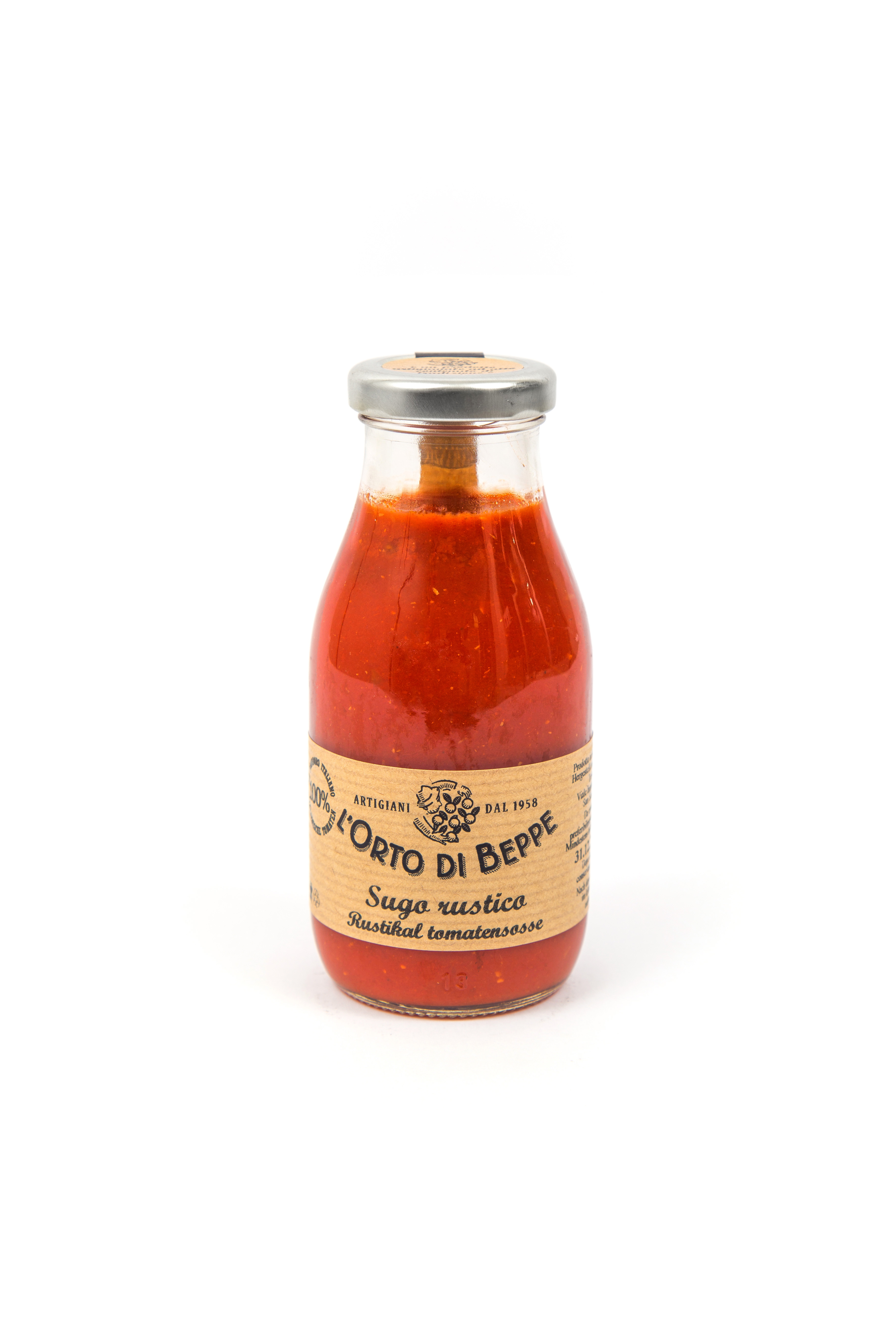 Sugo pronto a base di polpa di pomodoro con l’aggiunta di ingredienti semplici e genuini quali cipolla, carote e aglio, che conferiscono al prodotto sapori, profumi e aromi che rievocano alla mente quelli tipici della tradizione contadina.